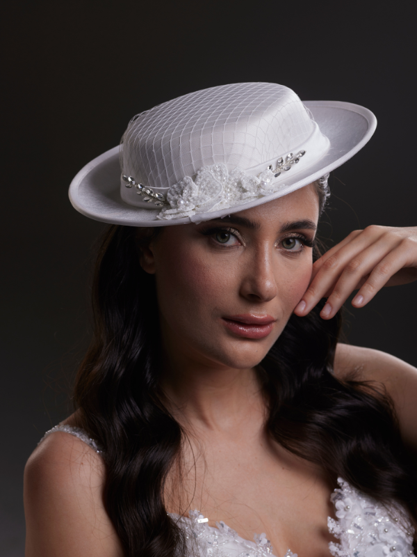 هذه القبعة البيضاء للعروس، المزينة باللؤلؤ وأحجار الكريستال، توفر خيارًا أنيقًا ليوم زفافك بنسيجها الشبكي وأناقتها البسيطة.