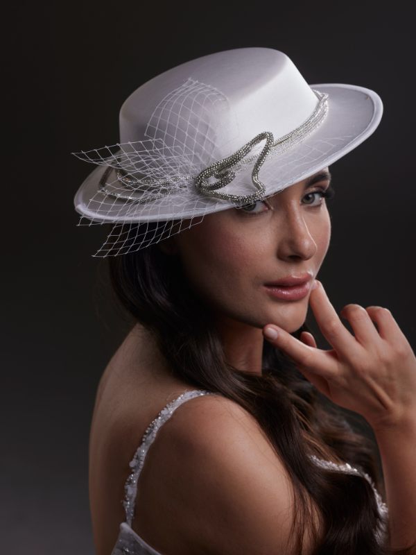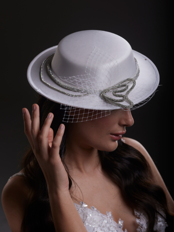 قبعة زفاف أنيقة بيضاء شبكية - قبعة زفاف بتصميم خاص مع تطريز فضي