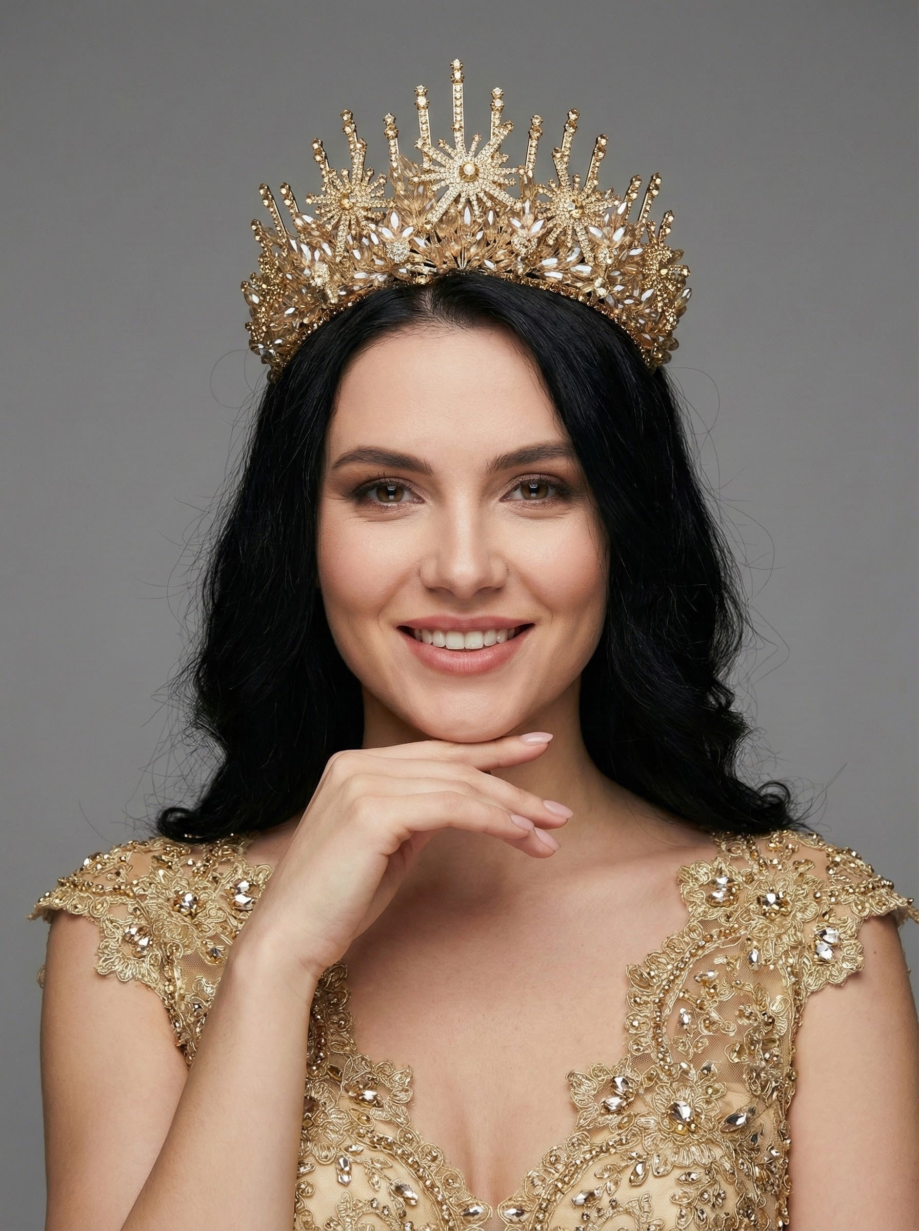 Göz alıcı taşlarla bezenmiş bu altın renkli taç, kına geceleri, nişan törenleri ve özel davetlerde sizi bir kraliçe gibi hissettirecek. El işçiliğiyle hazırlanan detaylar, ışıltılı taşlar ve zarif formu ile baş döndürücü bir şıklık sunar. Hafif yapısı sayesinde gün boyu rahatça kullanılabilir. Farklı saç modelleriyle uyumlu yapısı sayesinde stilinize kolayca entegre olur.