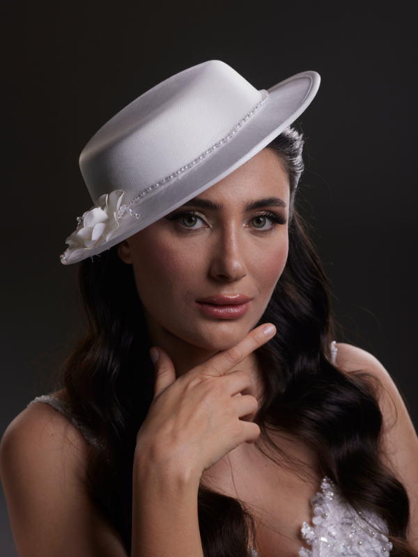 İnci şerit ve saten çiçekle tamamlanan bu beyaz nikah şapkası, sade ve zarif tasarımıyla gelinliğinizi tamamlar. Özel anlar için şık bir dokunuş.