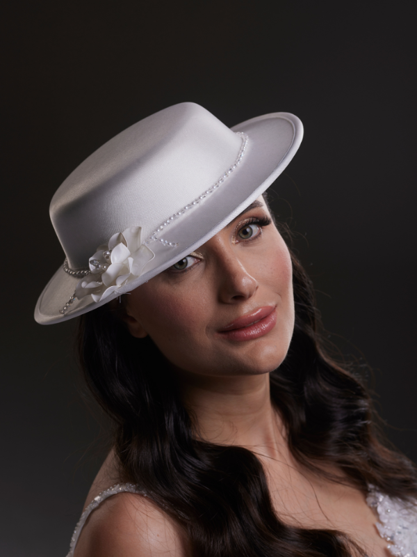 Saten Nikah Şapkası – İnci Detaylı ve Çiçek Aksesuarlı Gelin Şapkası
