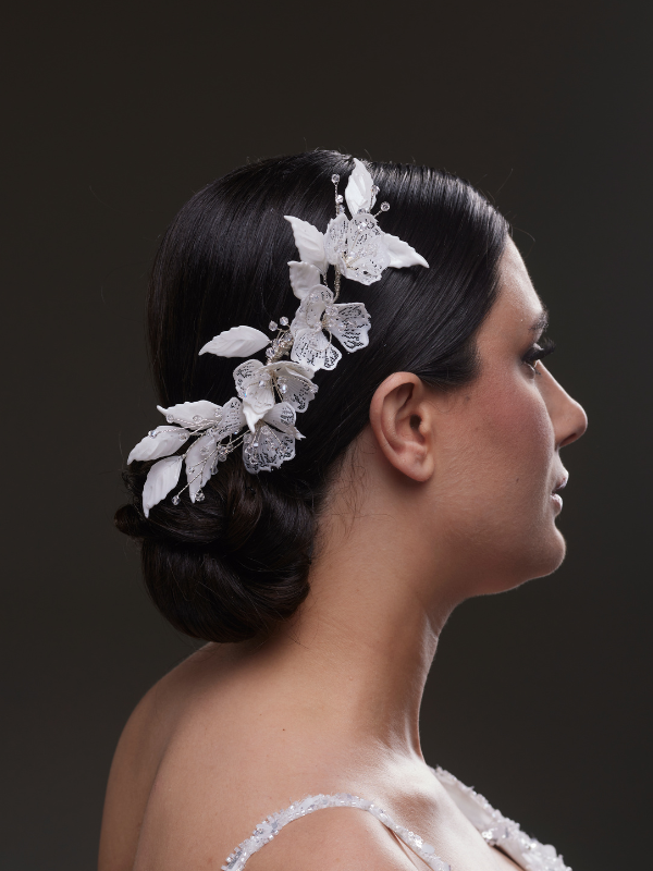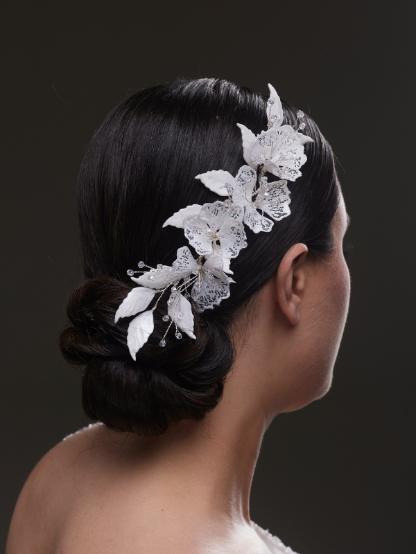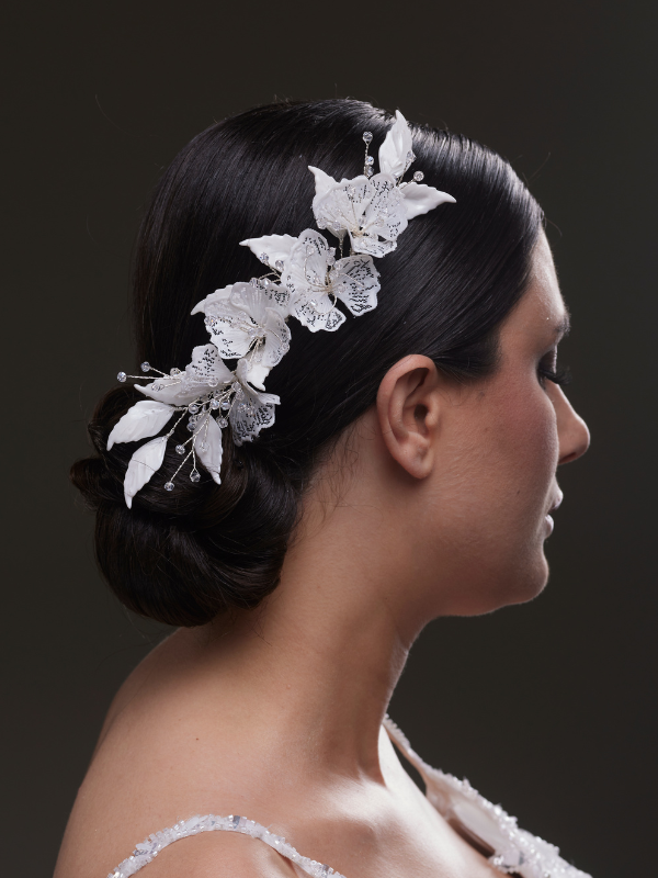 El işçiliğiyle hazırlanan bu dantel işlemeli uzun çiçekli saç aksesuarı, klasik ense topuzlarına zarif ve romantik bir dokunuş katar. Beyaz yapraklar ve kristal taşlar ile süslenmiş bu özel parça, düğün ve nişan gibi özel günlerde şıklığını tamamlamak isteyen gelinler için ideal bir seçimdir. Hafif yapısıyla gün boyu rahat kullanım sunar.