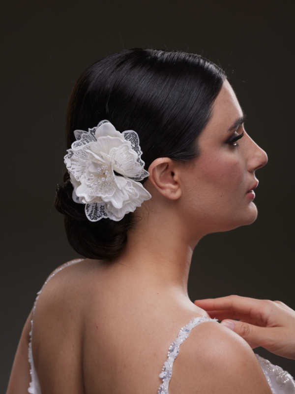 Küçük beyaz çiçek formunda tasarlanmış bu zarif saç aksesuarı, dantel detayları ve boncuk işlemeleriyle şıklık sunar. Ense topuzlarına veya yana ayrılmış saçlara romantik bir hava katar. Gelinliğinizle mükemmel uyum yakalamak için el işçiliğiyle üretilmiştir.