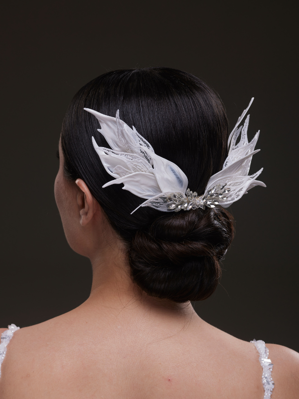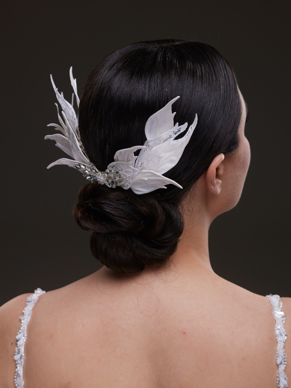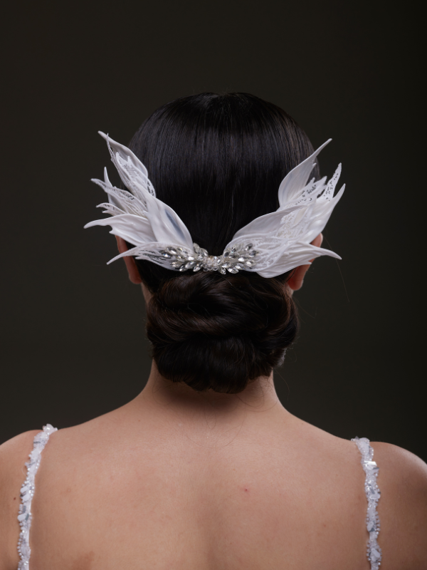 Tül yapraklar ve kristallerle tasarlanmış bu kanat formundaki saç aksesuarı, gelinliğinize etkileyici bir dokunuş katar. Ense topuzu üzerine zarifçe yerleşir ve arkadan bakıldığında şıklık ve masalsı bir duruş sunar. El işçiliğiyle hazırlanmıştır.