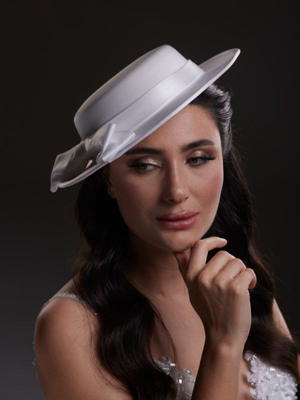 Sadelikten doğan zarafet! Büyük fiyonk detaylı bu beyaz gelin şapkası, modern gelinlerin nikah ve şehir düğünlerine özel tasarlandı.