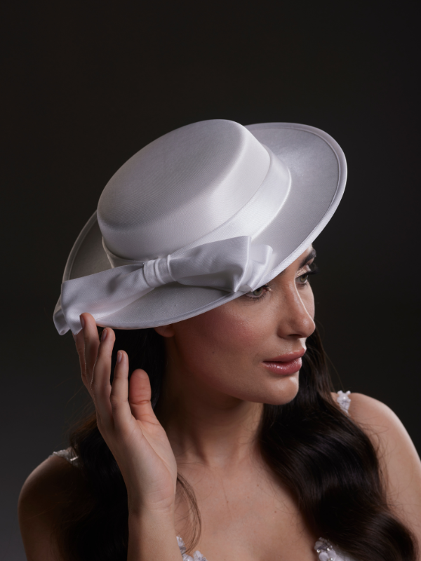 Saten Fiyonklu Beyaz Gelin Şapkası – Minimalist & Şık Tasarım